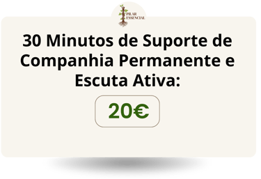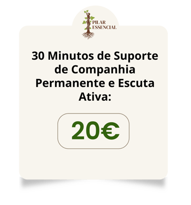 O Pilar Essencial é o meu compromisso de lhe oferecer 30 minutos de Companhia Permanente e Escuta Ativa – um espaço onde pode desabafar sem sentir que incomoda, sem a pressão de ter de ser forte, sabendo que está a ser validado por alguém que entende profundamente a busca por ordem, alívio e serenidade.